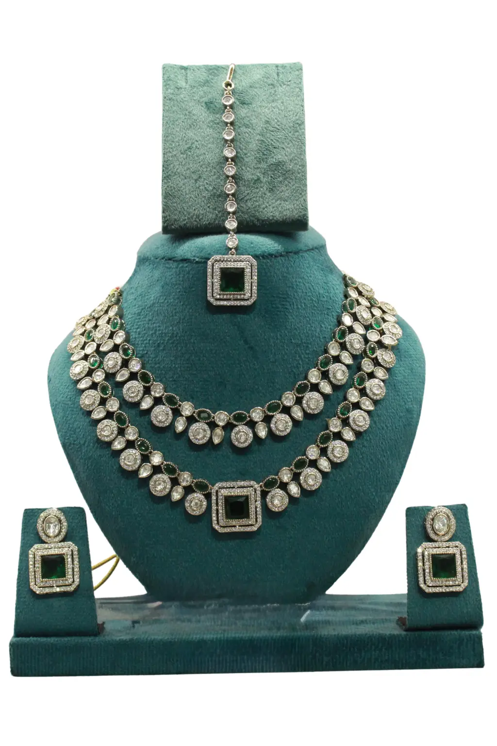 The combination of green stones with premium AD detailing gives this set a regal charm, making it ideal for bridal wear as well as festive and party occasions.