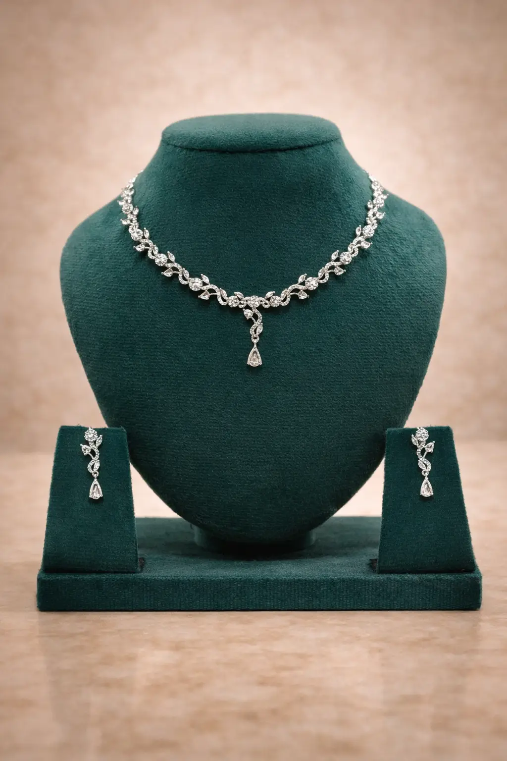 The matching earrings mirror the necklace’s sophisticated design, incorporating the same leaf and drop motif. The simple yet luxurious design makes it a perfect accessory for any formal occasion, from weddings to evening galas. With its timeless elegance and shimmering brilliance, the Eternal Blossom Necklace Set will surely be a statement piece in your jewelry collection.