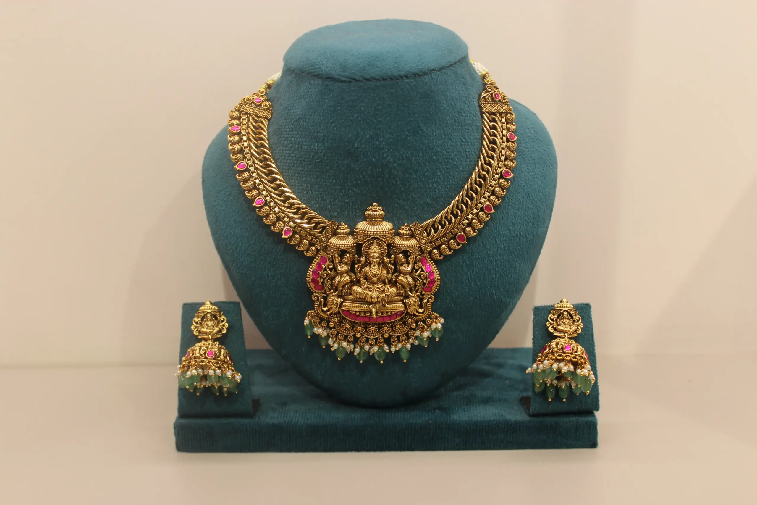 A majestic temple-style necklace featuring an intricate Lakshmi pendant with ruby accents and green bead drops, paired with matching traditional jhumka earrings.