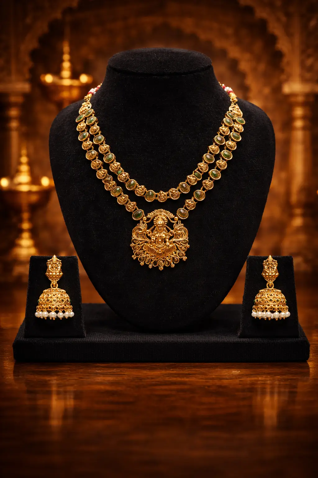 The necklace features a magnificent Lakshmi goddess pendant, symbolizing prosperity and blessings. The chain is adorned with delicate temple motifs and elegant green stone accents, adding a royal touch to the design. The detailed workmanship highlights traditional artistry, making it a perfect accessory for bridal wear, festive celebrations, and cultural events.