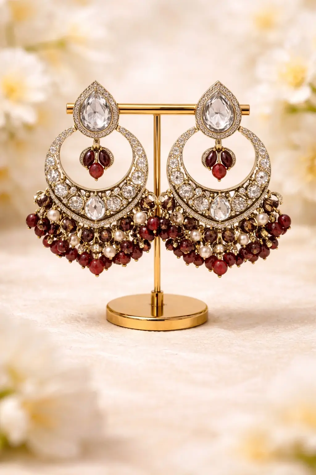 Stunning chandbali earrings featuring deep ruby accents, sparkling crystals, and pearl-bead drops for a rich and festive statement look.