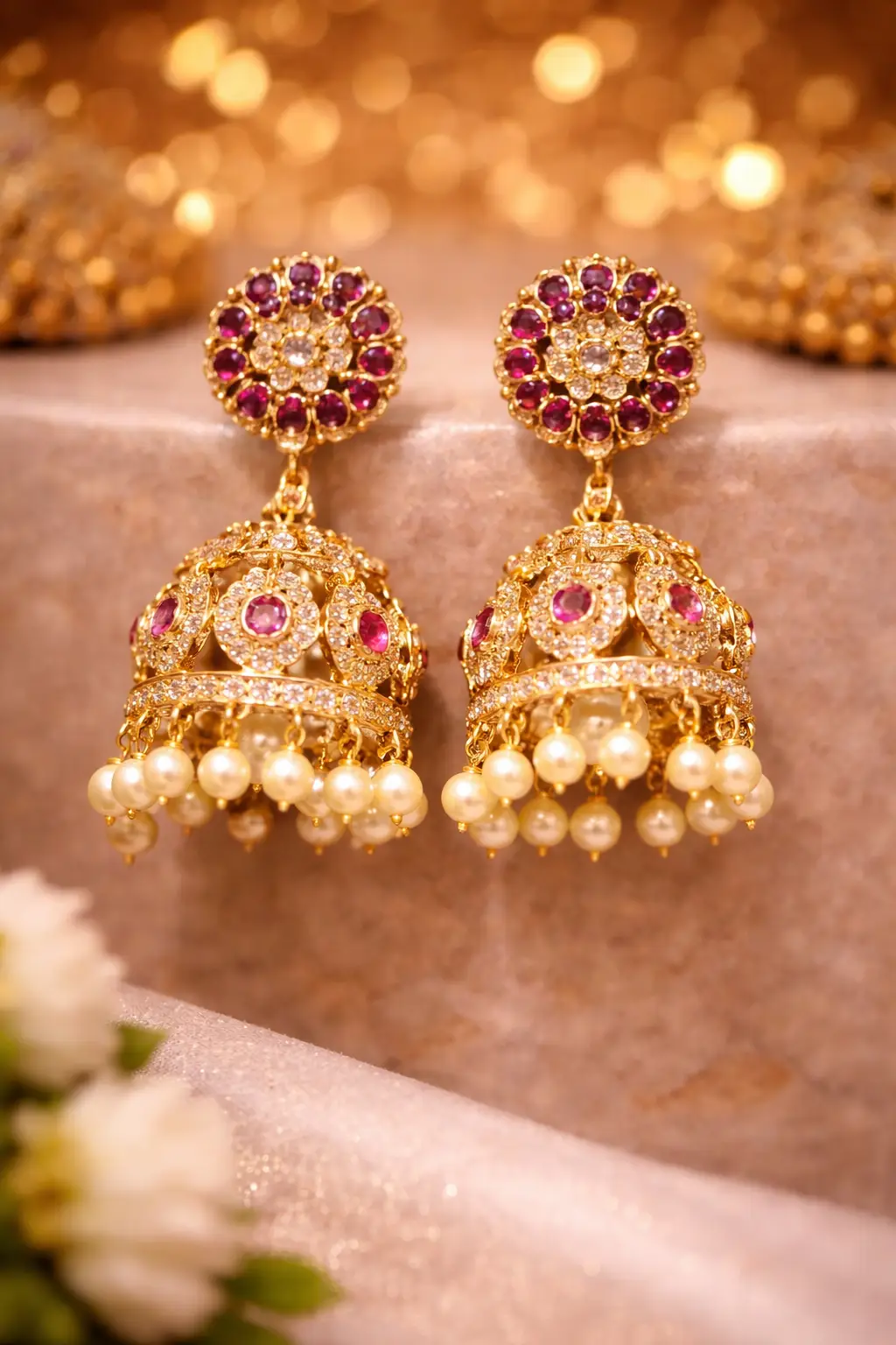 Stunning gold jhumka earrings adorned with vibrant rubies and sparkling diamonds, complemented by a string of lustrous pearls, perfect for weddings and celebrations.
