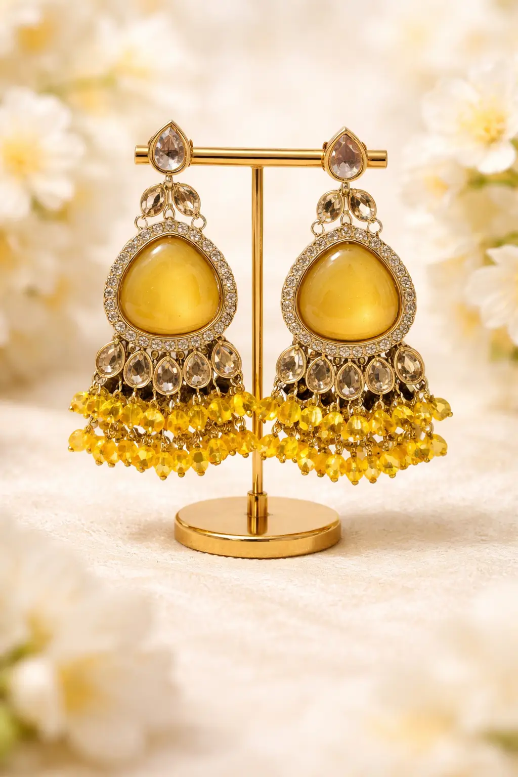Elegant earrings with a vibrant yellow center piece, crystal detailing, and cascading bead drops perfect for festive and statement styling.