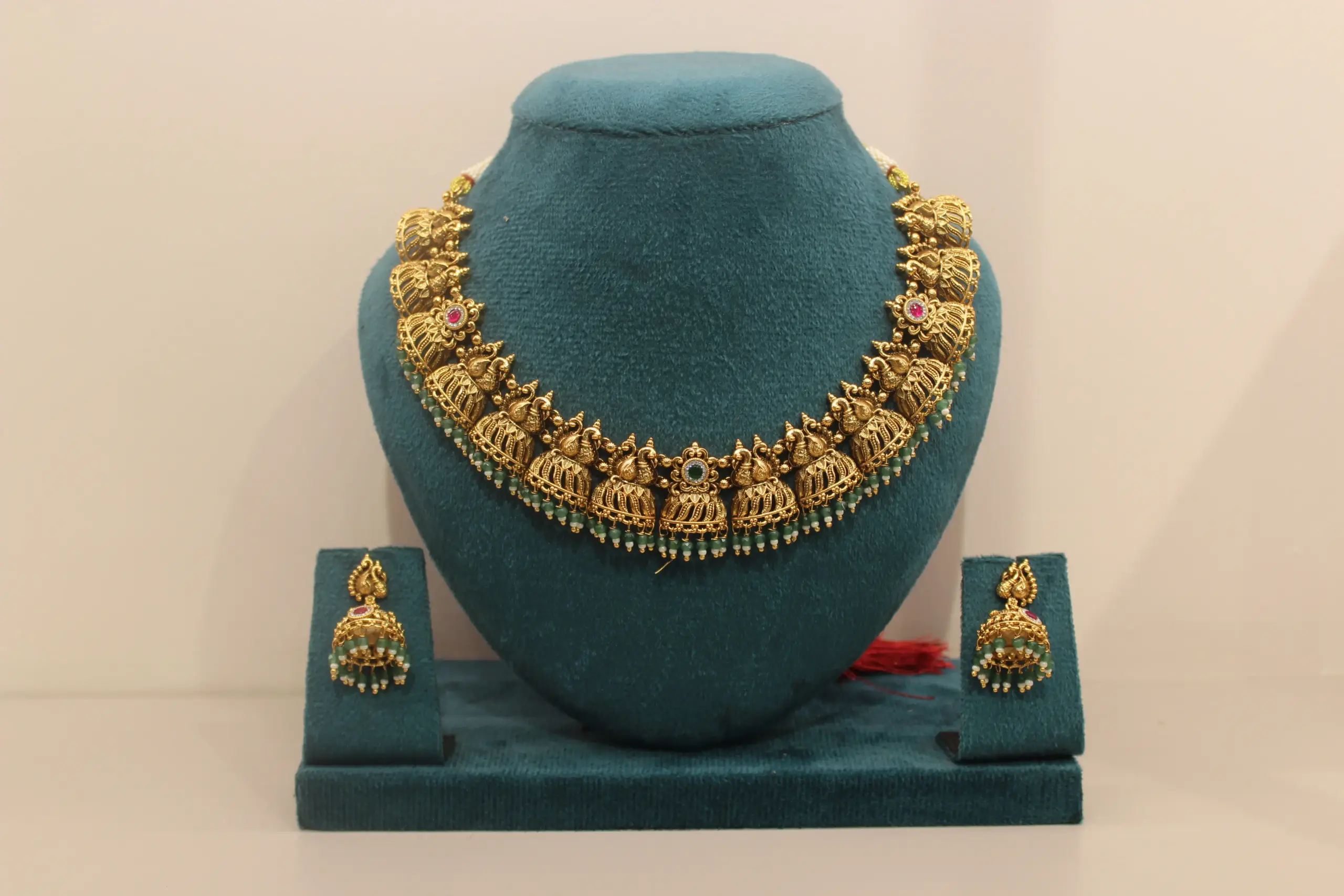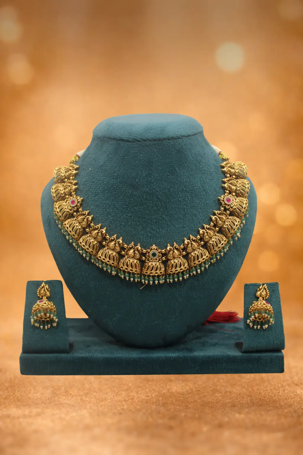 Celebrate timeless tradition with this Temple Jhumka Motif Antique Necklace Set, designed to reflect the elegance of classic South Indian temple jewellery. This unique necklace showcases a series of intricately crafted miniature jhumka motifs along the chain, giving it a rich and distinctive look.