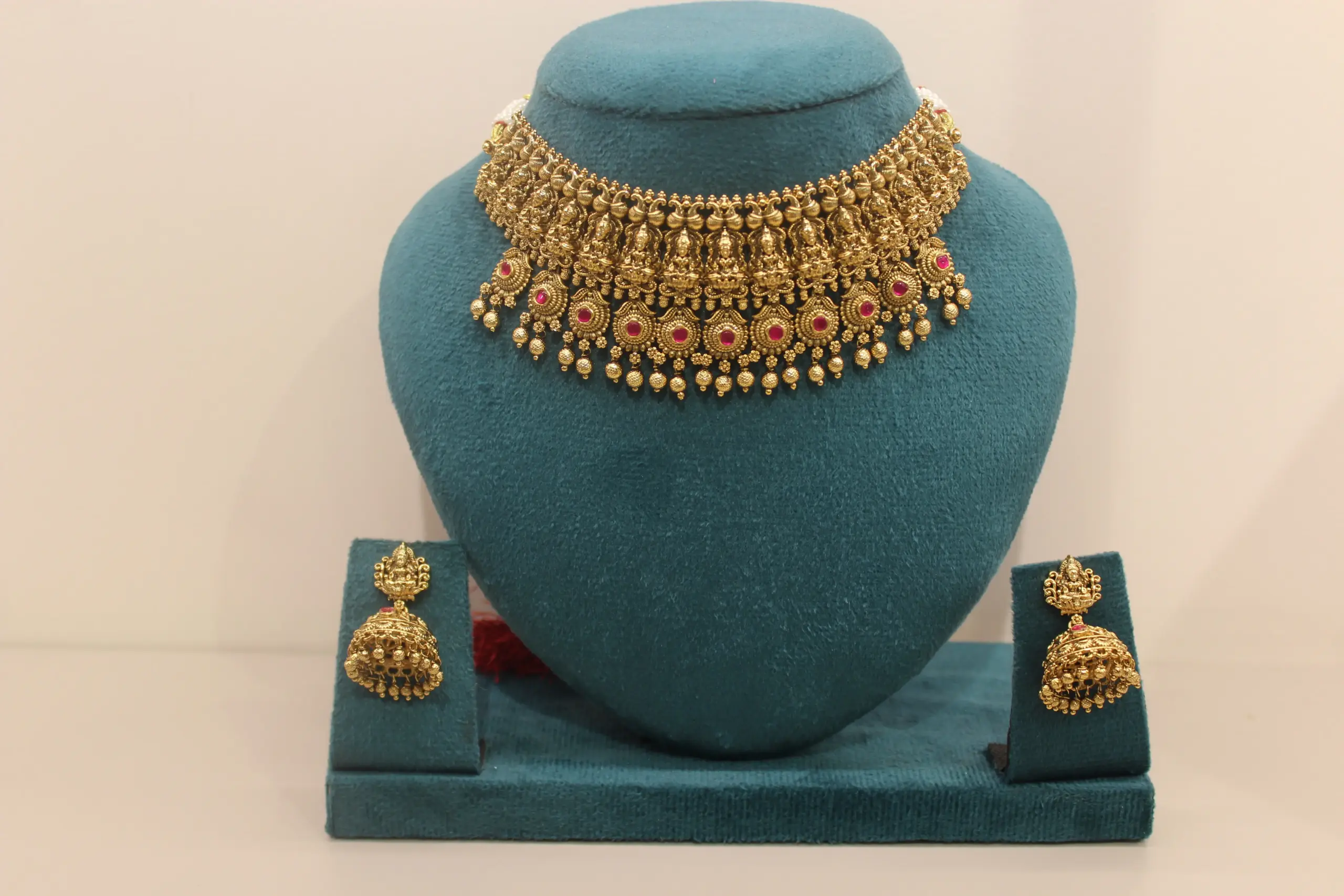 This set is complemented by matching jhumka earrings, featuring traditional temple detailing and coordinated design elements for a complete festive look.