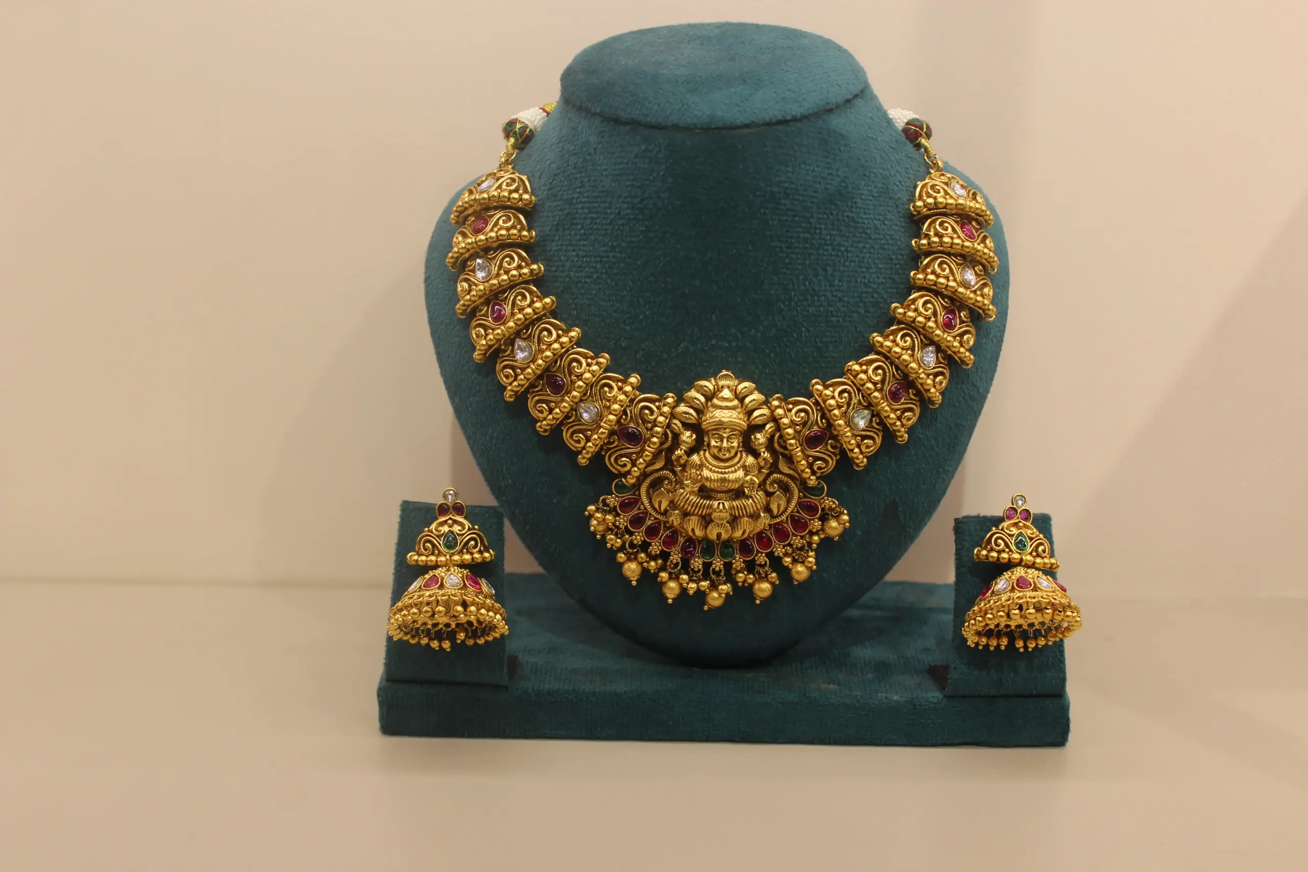 A bold temple-style necklace featuring a Lakshmi pendant with multi-stone accents and intricate antique detailing, paired with traditional jhumka earrings.