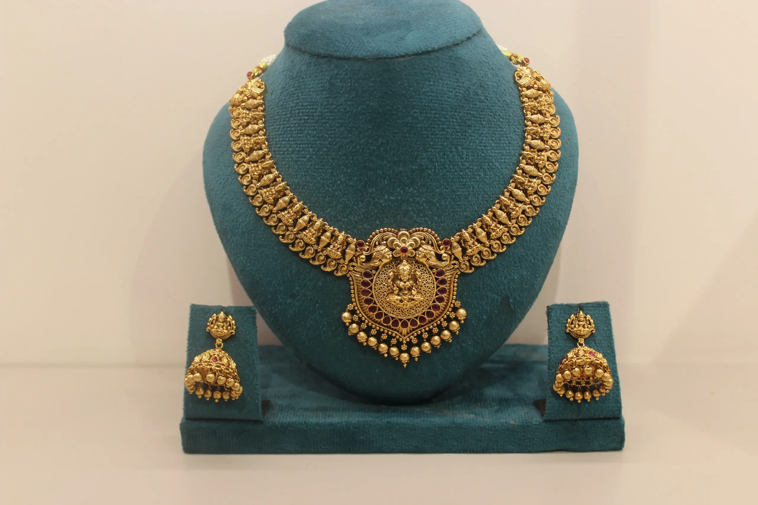 A grand temple-style antique necklace featuring a Lakshmi pendant with rich ruby accents, paired with traditional jhumka earrings perfect for bridal and festive wear.